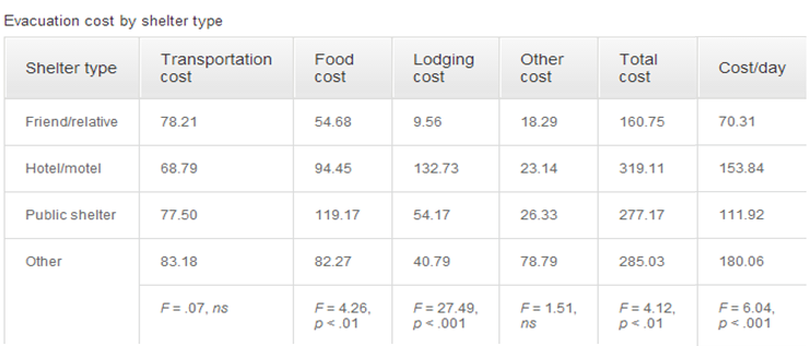 In addition to the burdens of lost-income and property damage, the act of evacuating itself is an expensive business. Researchers conducted a survey of individuals who evacuated in the wake of Hurricane Lili in 2002 and calculated the total cost of the evacuation.